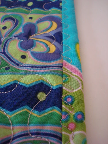 However, if you have a spot that you accidently pulled the binding fabric too tight or too loose, you will run away from the edge on the front (because you were following the wonky edge on the back). Now, I don't pin or clip my binding in any way, I just fold it and stitch (gasp!), so if you are a methodic pinner or clipper you probably won't run into this problem. This was the first time I ever used this method, and it is a pretty big quilt, so I have to assume it would be a lot easier with some practice and especially on much smaller baby quilts (where I think machine sewn binding makes the most sense). This was the wonkiest spot I had, and I can live with it. I'm not one for pointing out imperfections, but didn't want you all to think this was some magic perfect technique :). Please disregard the cat hair in the close ups.